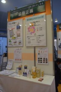 テクニカルショウのベンチャーブースで、協働企画として2017年2月に出展しました。出展内容は、フルボ酸飲料「デオドリンク」、フルボ酸カプセル「専門店のフルボ酸」、フルボ酸配合ヘアシャンプー、フルボ酸配合ダメージヘア・リペアオイルなど。